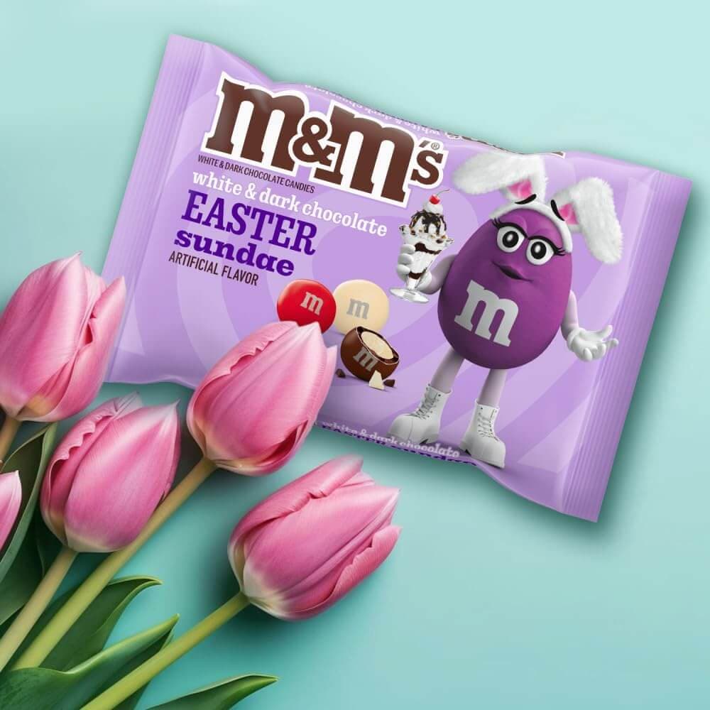In 2024, for example, M&M’s reintroduced its Easter Sundae flavor: Dark chocolate M&Ms with a white chocolate center. This product’s packaging included a fun, pastel purple backdrop with an M&M character dressed as a bunny holding an ice cream sundae.