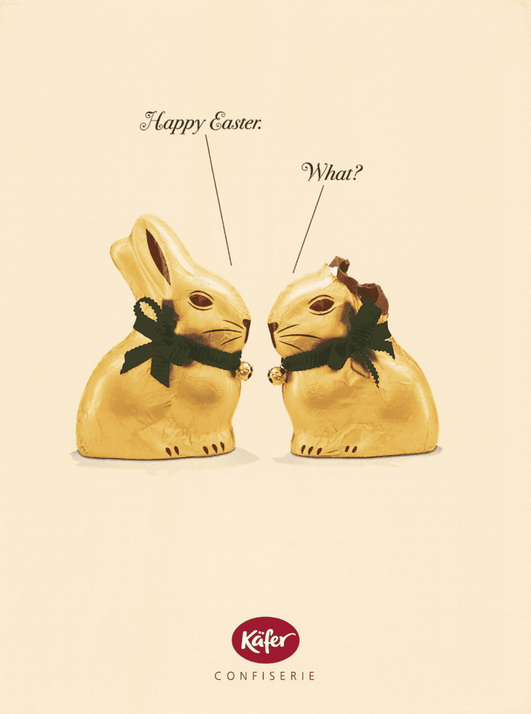 Kaefer Confiserie’s 2004 Easter ad is hilariously straight to the point. It has no underlying meaning besides highlighting the deliciousness of its chocolate Easter bunnies in a way that makes customers giggle.