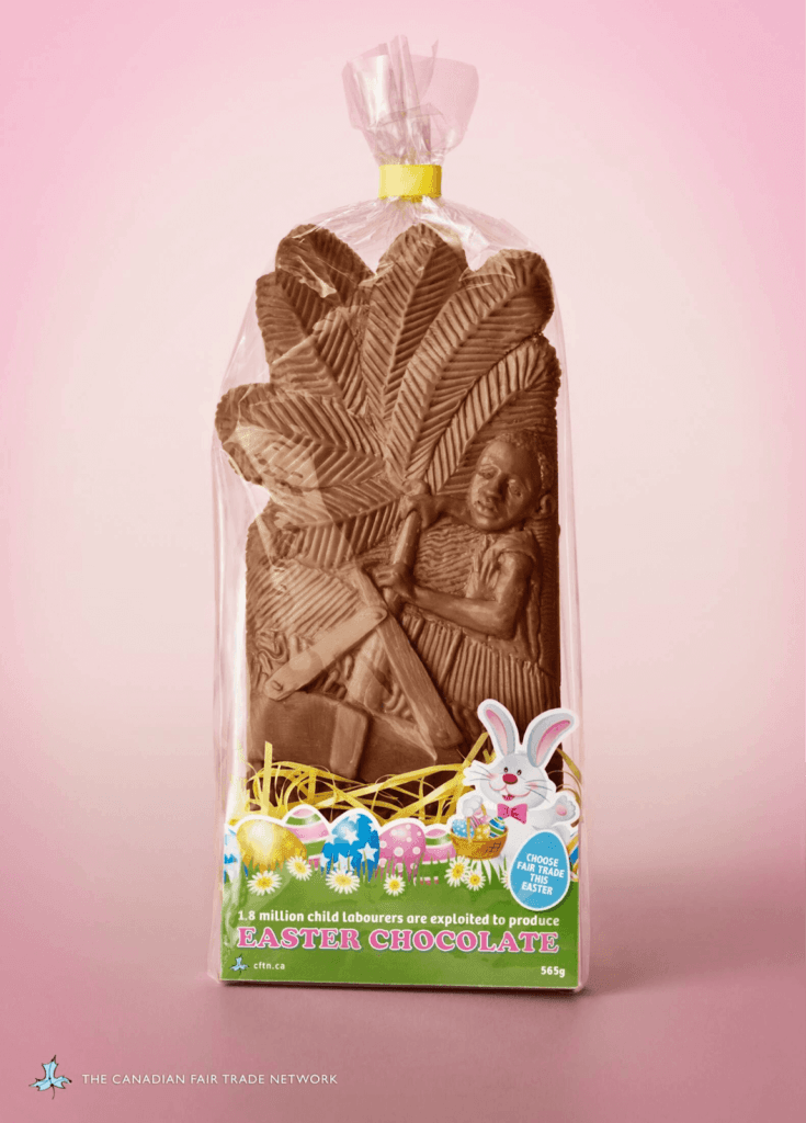 The Canadian Fair Trade Network’s 2016 Easter advertising campaign shed light on the dark side of the chocolate-making industry. With chocolate being a heavy focus during the Easter holidays, their campaign highlighted the ethical concerns behind chocolate production, urging consumers to focus on fair trade chocolate.
