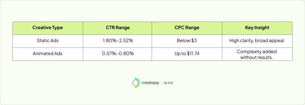 Across all segments, static creatives like "Congrats" outperformed animated alternatives in clarity and direct messaging.