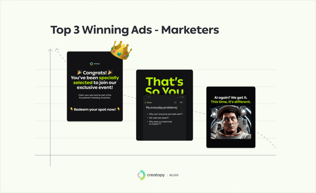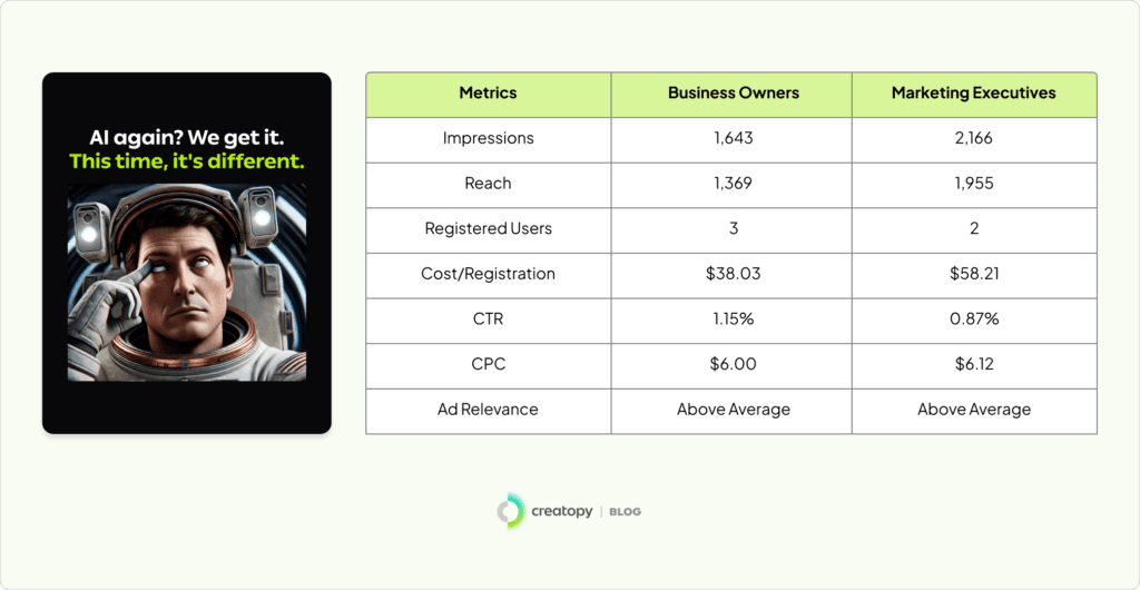 To challenge our assumptions, we also included a few wildcard designs—generic, cliché creatives that you’d expect to blend into the background. From poking fun at AI fatigue to evoking FOMO (“Creative minds are already in!”), we aimed to see if simplicity or predictability could outperform personalization.
