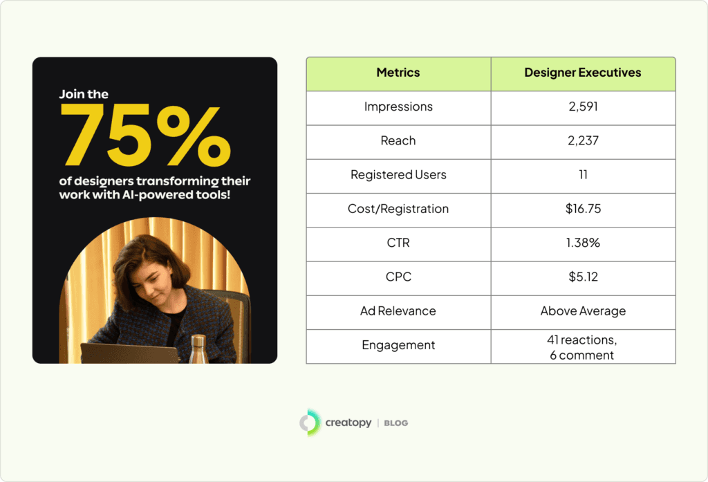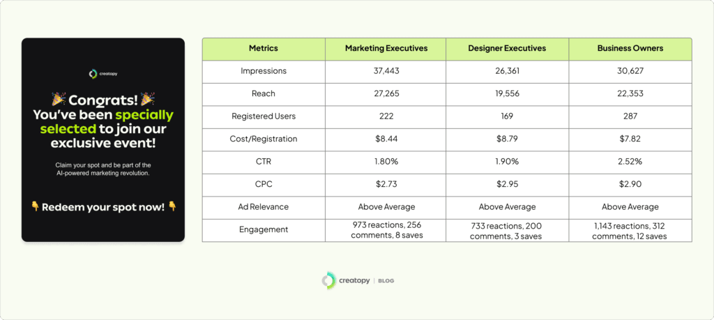 Top creative: The "Congrats" ad consistently emerged as the highest-performing visual across all three audience segments—Marketing Executives, Designer Executives, and Business Owners. Its celebratory and universal tone made it broadly appealing, driving the best metrics in impressions, CTR, and cost-efficiency.