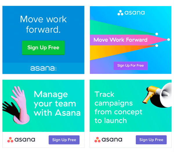 Here is a cool example of how to use vivid colors in your banner ads. Asana redesigned their brand identity in 2015 and found out that its brand is characterized by 6 points: intentional, empowering, passionate, playful, authentic, and effective.