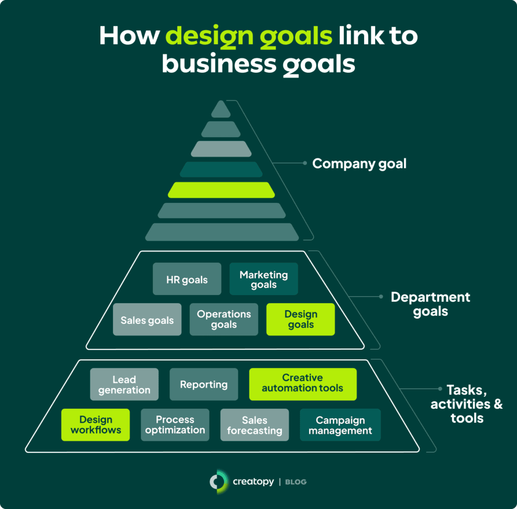 Once you’ve clarified your design goals, see how—or if—they link to company-wide goals. This may feel like a stretch, but you may struggle to convince decision-makers to purchase if a creative automation tool only serves lower-level goals without contributing to broader objectives.
