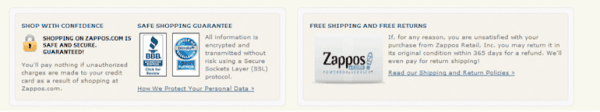 To increase the credibility rate, you can add shipping options on your product and cart page. Take a look at the example from Zappos that tells customers to shop with confidence as all information is encrypted with an SSL protocol. Moreover, they offer a free shipping and free returns option.