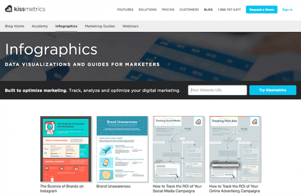 Kissmetrics are a great example of how to use visual content for your blog and create a dedicated page for them.