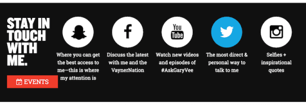 If you go to his website you can see that he creates a call-to-action by giving you the choice to stay in touch with him on Snapchat, Facebook, Twitter, Instagram and Youtube.
