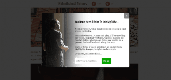 Bloggers also use this kind of strategy to build their mailing list. If we look at Jonathan Fields blog you will see a long written pop up where he is inviting the user to get to know him better while he is traveling around the world. I like this example for 2 reasons: 1 – because he want to be different so he wrote a quite long pop-up to create a context with the audience and 2 is the CTA button with a simple message "I'm in".