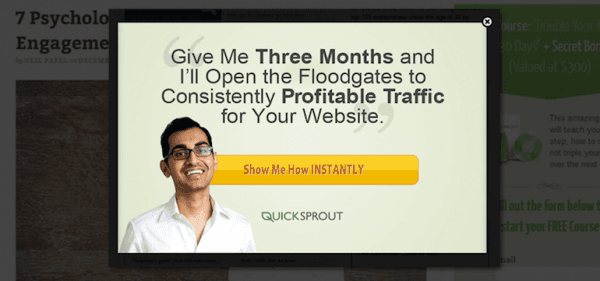 This is an old exit pop-up from Neil Patel's blog Quick Sprout where he is selling his services by using his own personal branding elements and also by showing the reader that he is behind the Quick Sprout brand. Do you see that in the headline he bolded 2 important things that his audience is interested? "Three Months" that means time, because time is money and today time is limited, and "Profitable Traffic" because traffic without conversion doesn't mean anything in the marketing world, right? Also check out the message in the CTA button "Show Me How INSTANTLY" – an urgency moment to make the user click on it.