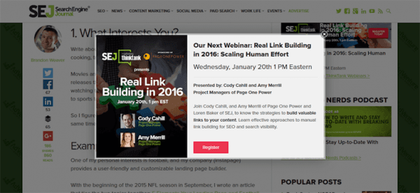 [Tweet "Use a well designed pop-up to show your webinar as @sejournal does"]