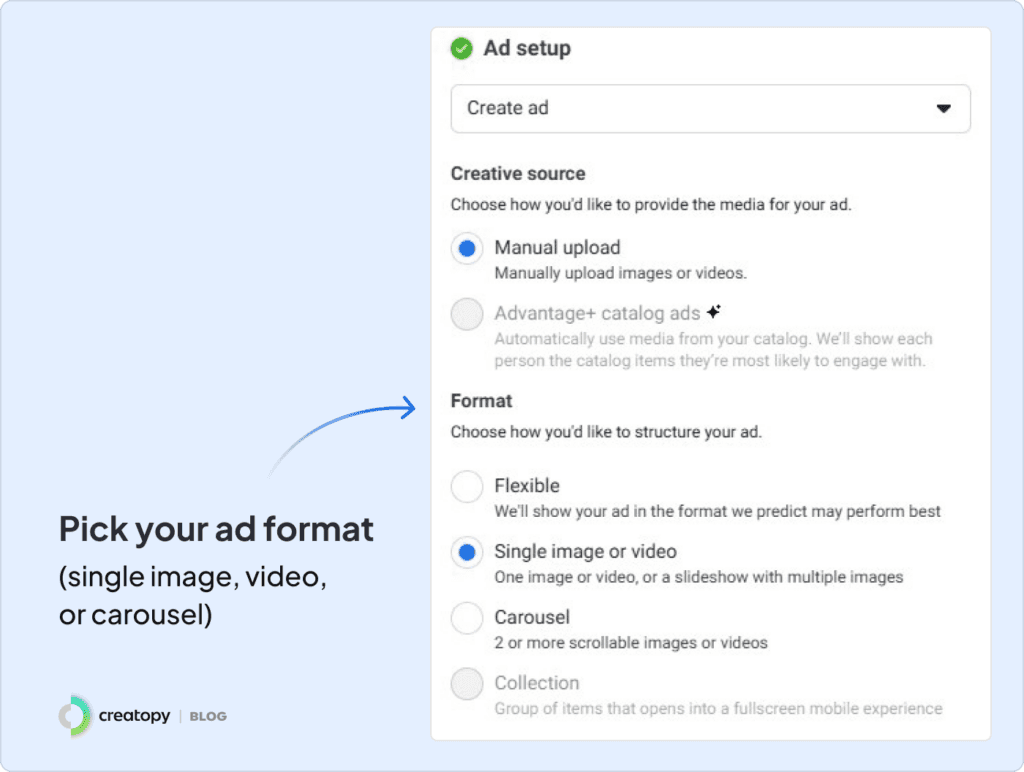 Step 6: Pick your ad format (single image, video, or carousel) and choose the right ad sizes.