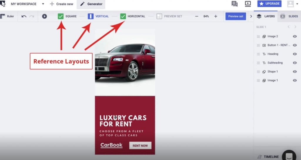 Once you choose the size, the next step is to set the reference layouts, to help our AI get an idea on what you want. You can decide where to reposition all the elements and layers in vertical, horizontal and square sizes.