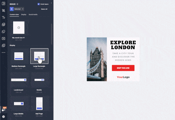 Now you can resize your banner in just one click, without any further adjustments. And, as a bonus, you can start from one design and generate many other banner sets or create AB tests.